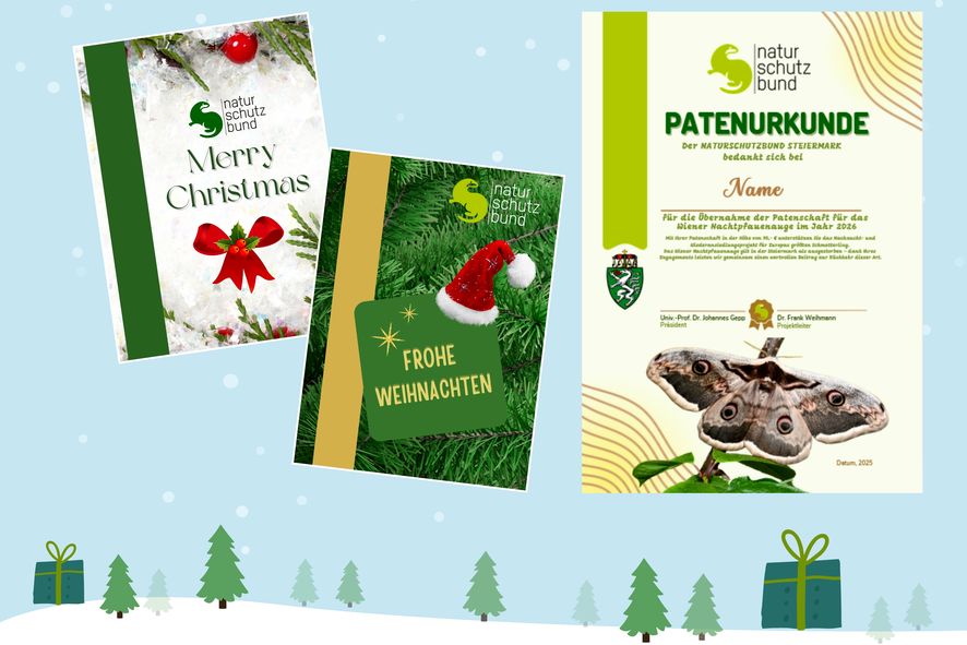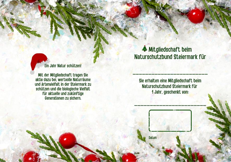 Schenken Sie eine Mitgliedschaft für ein ganzes Jahr – inklusive aller Vorteile wie der Vereinszeitschrift "Natur&Land", die viermal jährlich frei Haus kommt u.v.m. Mit der Mitgliedschaft leisten Sie einen aktiven Beitrag zum Erhalt wertvoller Lebensräume und zur Sicherung der Artenvielfalt in der Steiermark – für heutige und kommende Generationen. Teilen Sie uns Ihre Daten und jenen der beschenkten Person mit. Wir senden Ihnen anschließend eine persönliche Weihnachtskarte- je nach Wunsch in der Version weiß oder grün- zuzüglich Porto zu, die Sie festlich unter den Christbaum legen können.