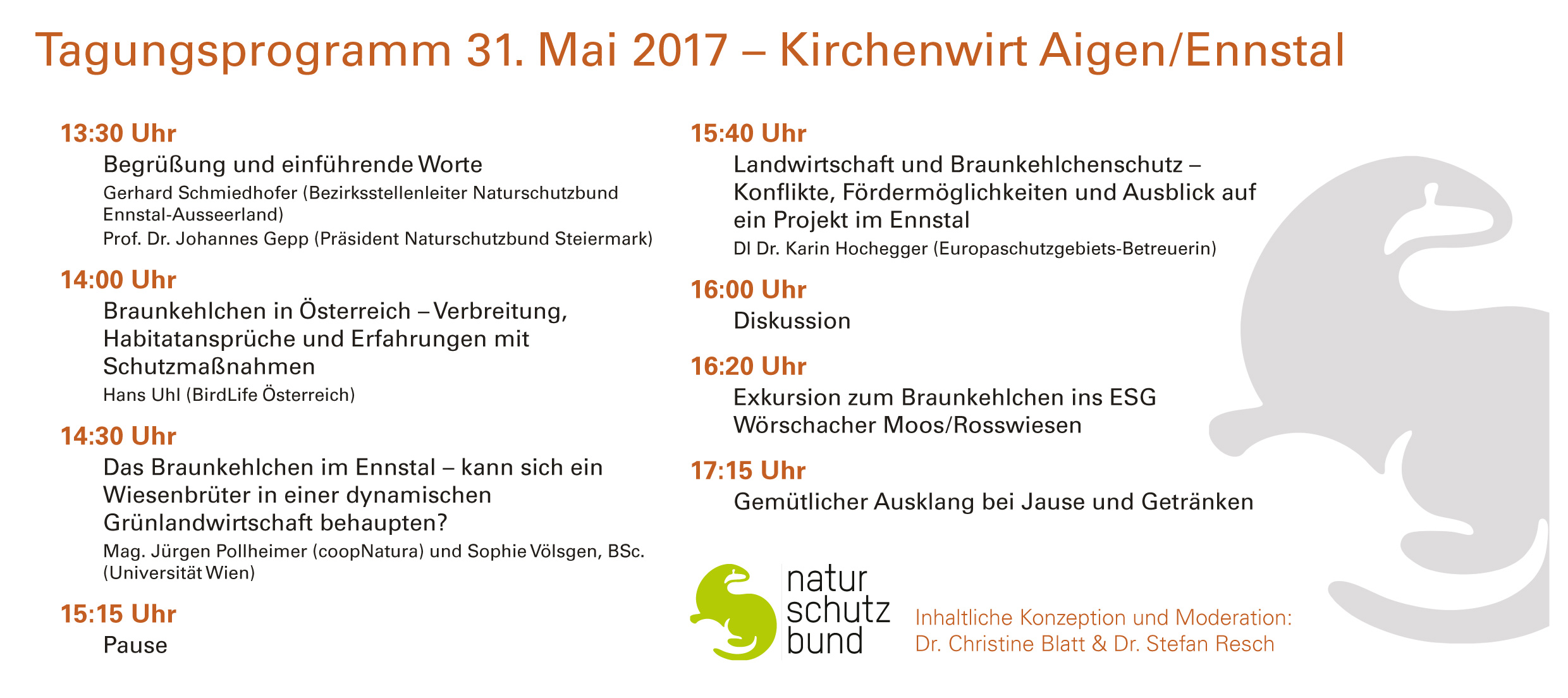 Der Naturschutzbund lädt zur Braunkehlchen-Tagung im Steirischen Ennstal! Als Wiesenbrüter ist das Braunkehlchen (Saxicola rubetra) durch den Strukturwandel der Landwirtschaft zunehmend gefährdet. Die Tagung mit Exkursion bietet Gelegenheit zum Wissens- und Erfahrungsaustausch sowie zur gemeinsamen Diskussion von geeigneten Schutzmaßnahmen.