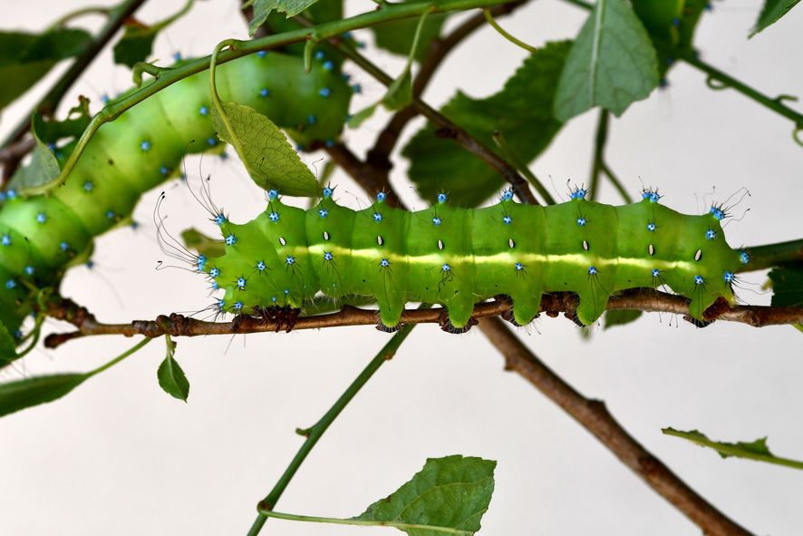 Frisch geschlüpfte Raupen, die sogenannten L1-Raupen (Larvenstadium 1) sind 5-6 mm lang, schwarz mit 4 Reihen hellbraun/orangeroter, Borsten tragender, Punktwarzen. Ab dem dritten Larvenstadium (L3) färben sich die Raupen grün und die Punktwarzen sind gelb. Im vierten Stadium bleibt der Raupenkörper satt grün doch die Punktwarzen sind Magenta. Im letzten Larvenstadium sind die Raupen bis zu 120 mm lang, leuchtend hellgrün und tragen himmelblaue Punktwarzen. Kurz vor der Verpuppung verfärben sich die Raupen gelbbraun. Der Seidenkokon, den sich die Raupe über Stunden spinnt, ist erst weiß und verfärbt sich alsbald bräunlich. Die Kokons werden meist direkt am Samtfuß des Fraßbaums angelegt. Ältere Larvenstadien besitzen zusätzlich zu den Borsten lange, flüssigkeitsgefüllte Stacheln.